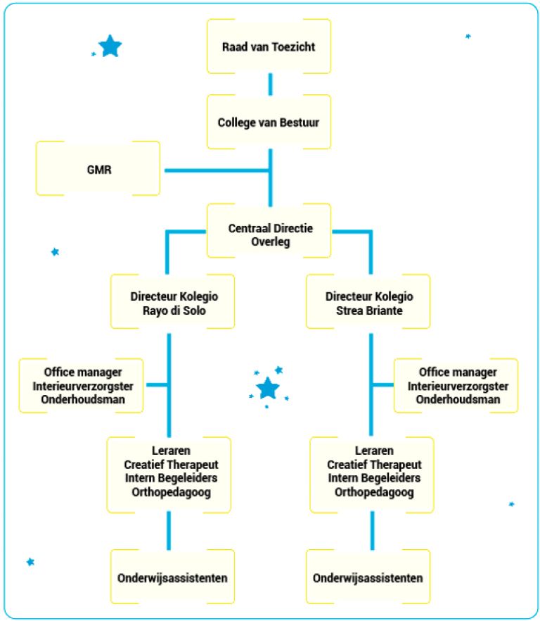 De algemeen directeur legt periodiek verantwoording af over het gevoerde beleid aan de RvT. De organisatie wordt geleid door een algemeen directeur, met een beperkte algemene en secretariële ondersteuning van de officemanagers van beide scholen. De directeuren van de scholen bieden advisering en ondersteuning op de beleidsterreinen. De algemeen directeur en de directeuren van de scholen zijn in het Centrale Directie Overleg gericht op het scheppen van voorwaarden waardoor de leerkrachten en ondersteuners de gewenste resultaten kunnen bereiken. De algemeen directeur bepaalt de beleidskaders en mandateert de uitvoering aan de directeuren.
