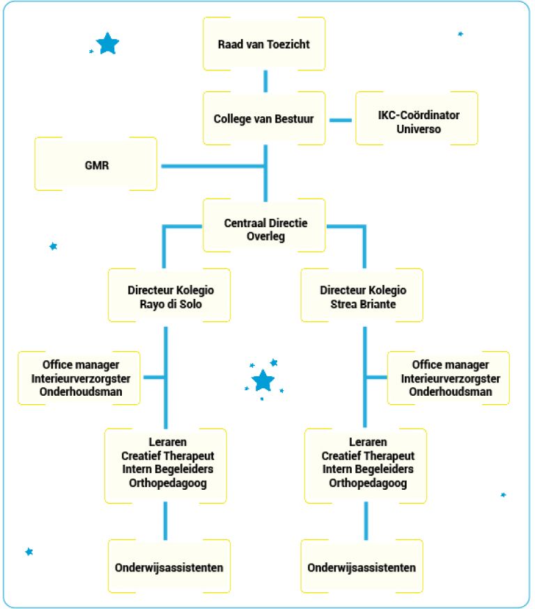 Periódikamente e direktor general ta responsabilisá e maneho ehekutá na e konseho di supervishon. E direktor general ta dirigí e organisashon i ta konta ku n sosten atministrativo i general limitá di e office manager di e dos skolnan. Direktor di e skolnan ta duna konseho i sosten riba diferente área di maneho den skol i enseñansa. Den konsulta sentral di direktiva, e direktor general huntu ku e direktornan di skol ta enfoká riba krea e kondishonnan pa e maestro- i otro empleadonan por realisá e metanan. E direktor general ta determiná e kuadro di maneho i ta delegá e ehekushon na e direktornan.